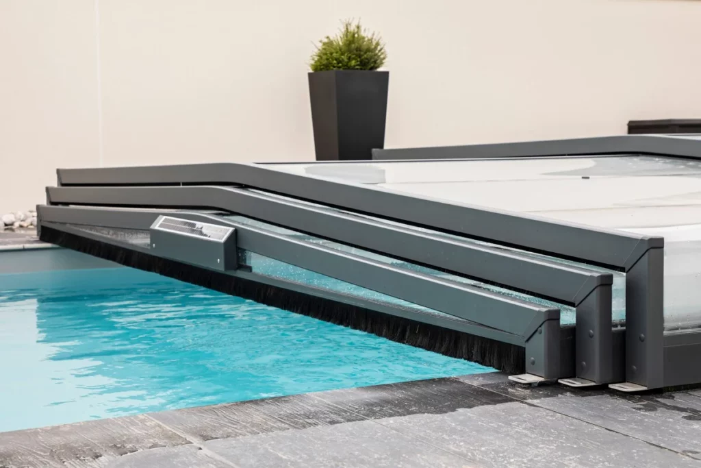 Un toit totalement plat présente des contraintes techniques importantes, notamment en matière d’écoulement des eaux. Le toit semi-plat de l’abri de piscine semi-plat permet une meilleure gestion des charges et des intempéries, tout en conservant une esthétique moderne et épurée.
