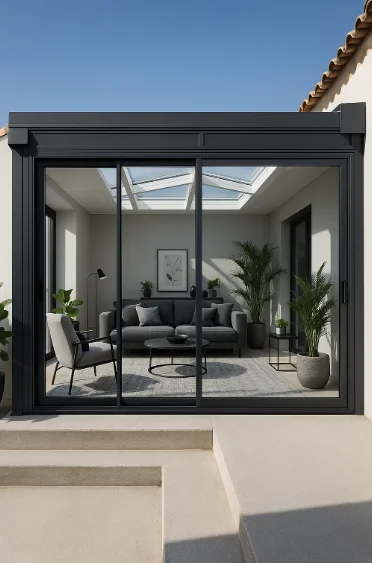 Conçue pour une praticité au quotidien, cette véranda de 20m2 à Gignac la Nerthe est équipée d’un coulissant à trois vantaux sur trois rails. Ce système permet une ouverture maximale pour faciliter l’accès à l’extérieur et favoriser la circulation de l’air. Les poignées clic-clac sont ergonomiques et offrent une prise en main confortable, tout en assurant une sécurité optimale. Avec l’aménagement d’une véranda de 20m2 à Gignac la Nerthe, vous optez pour une solution d’aménagement qui allie performance et esthétique.