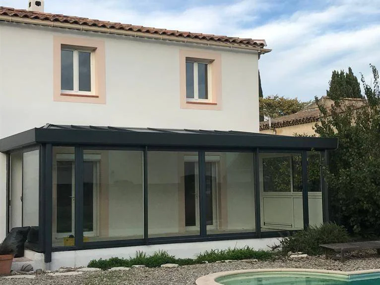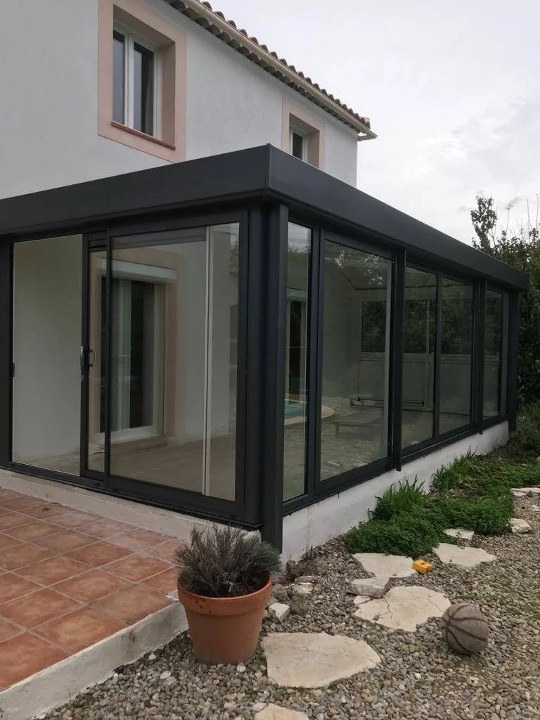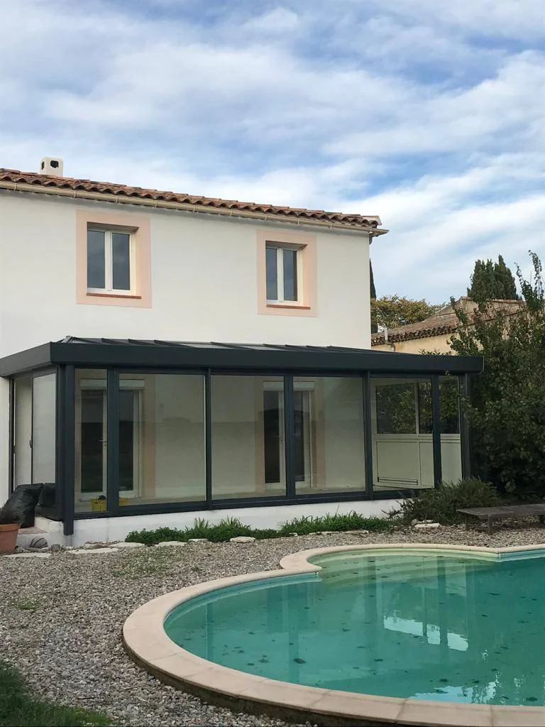 Archi véranda vous présente cette magnifique véranda moderne en aluminium gris anthracite avec vue sur la piscine pour nos clients qui se situent à Fos Sur Mer.