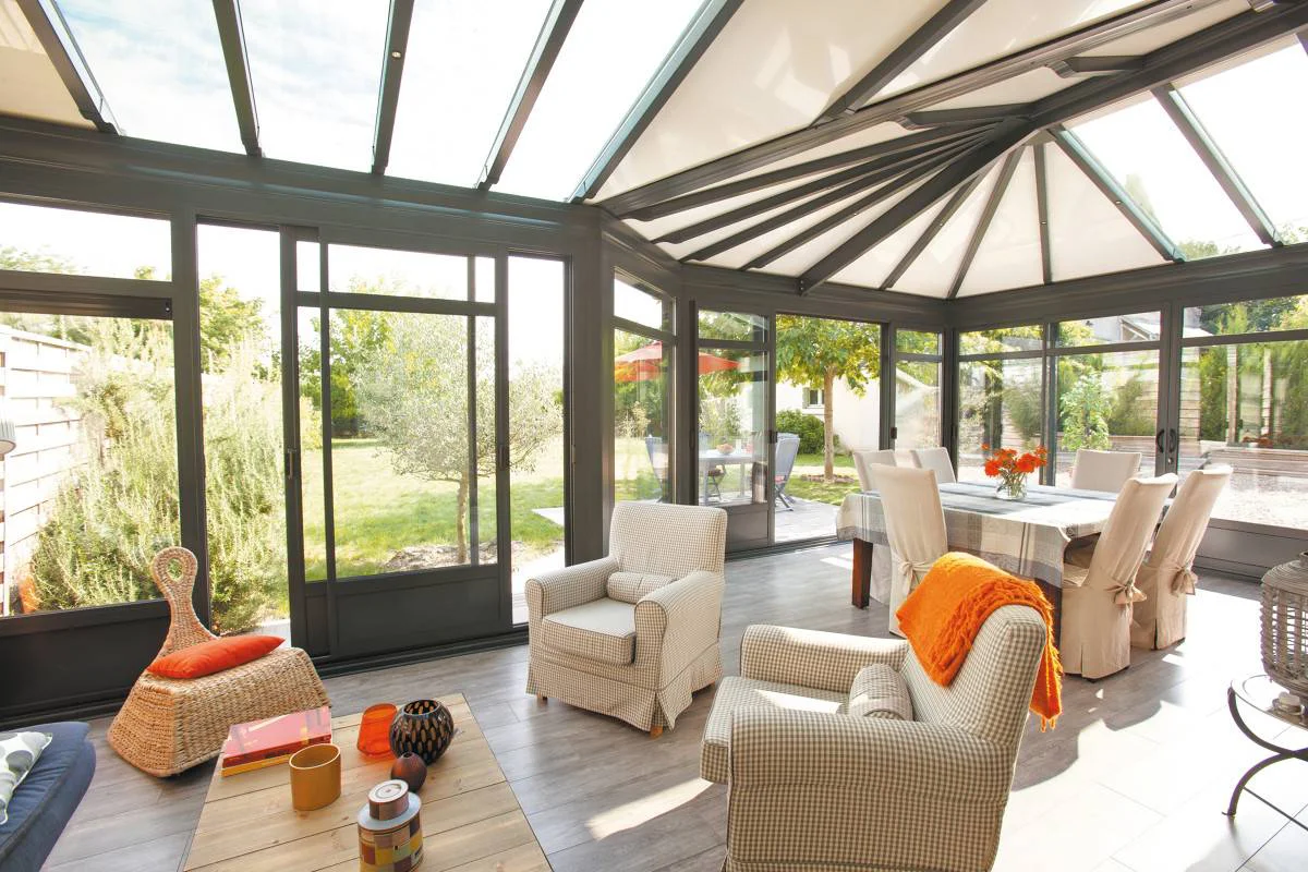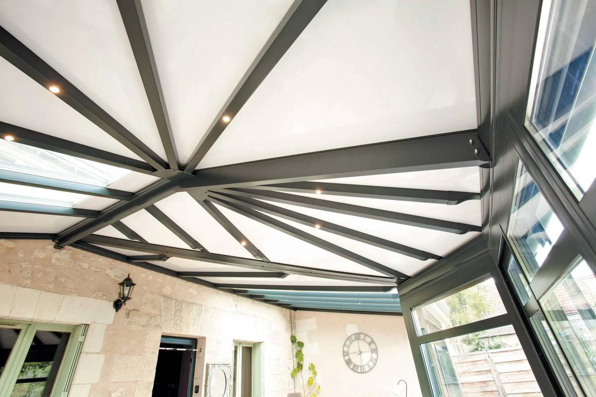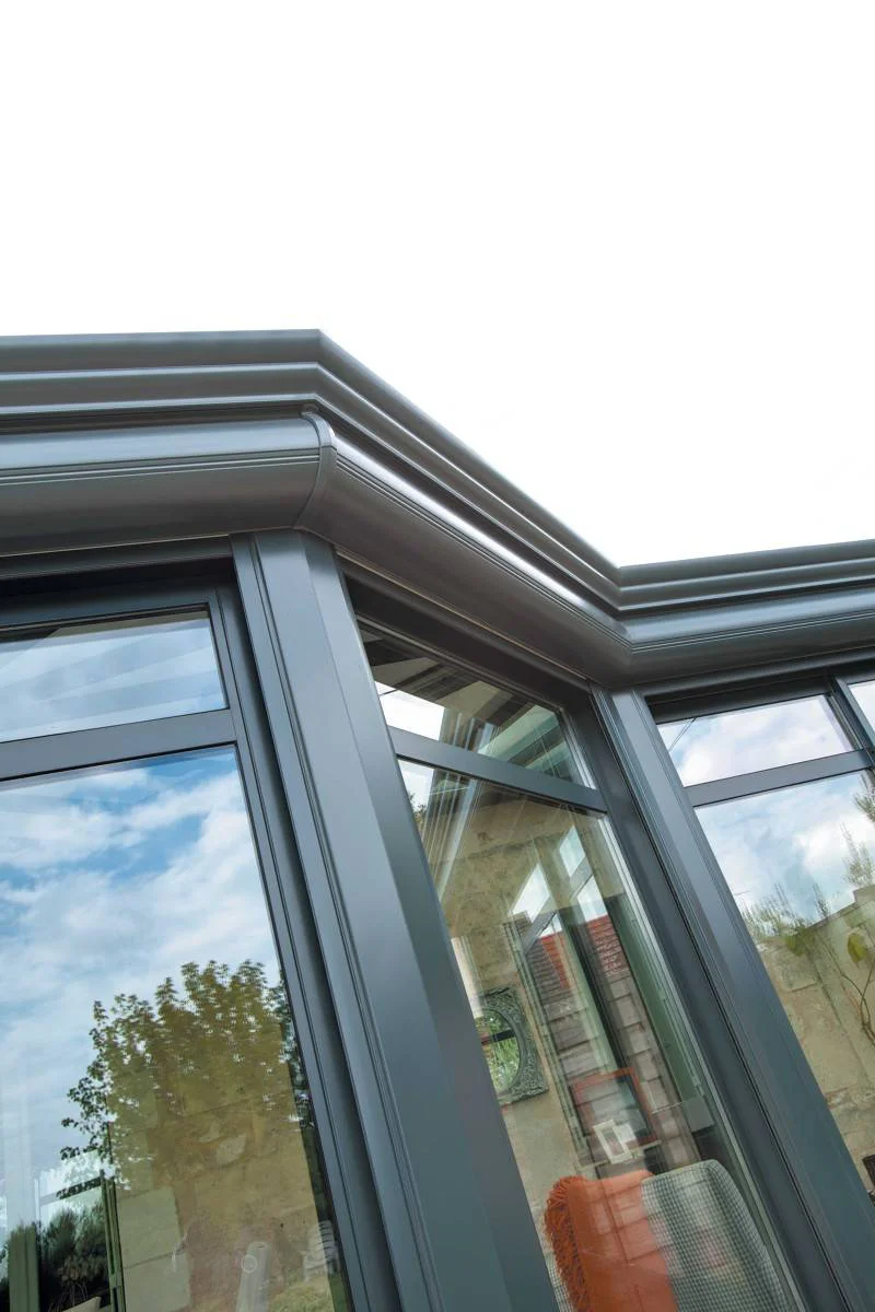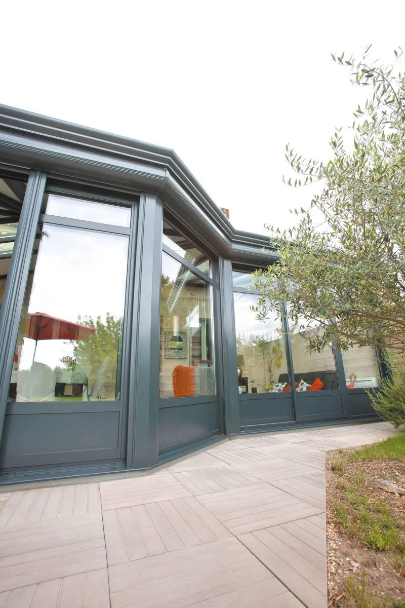 La véranda Eleganz avec volets roulants de Gustave Rideau au style classique se distingue par une élégante toiture chevronnée et une corniche soignée qui abrite des volets roulants. Sa forme en léger L accueille une toiture chevronnée en étoile qui amène du cachet et du caractère à l’habitation. Celle-ci reste lumineuse grâce à des puits de lumière et des spots dissimulés dans chaque chevrons. Des décors de vitrage sont également présents dans l’ensemble des coulissants. Sa couleur gris anthracite s’accorde parfaitement avec le reste de la maison et donne un élan de modernité.